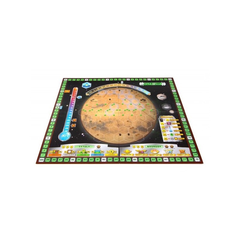 Mapa Elysium przeniesie graczy prawie na drugą stronę równika Marsa. Otworzy się przed nim północ regionu ze swoimi rozległymi nizinami, na których można stworzyć oceany, i południe obfitujące w różne minerały. Jeśli komuś uda się umieścić obszar na Olympus Mons, najwyższym szczycie w całym Układzie Słonecznym, otrzyma 3 darmowe karty.