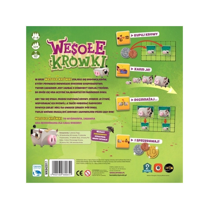 Poznajcie Wesołe Krówki - planszówkę, którą pokochały tysiące graczy na całym świecie! Wejdzcie w role farmerów starających się zarobić jak najwięcej na swojej trzodzie. Każdy z graczy posiada niewielką, rodzinną farmę - sprawcie, żeby to właśnie wasze osiągnęły największe zyski.