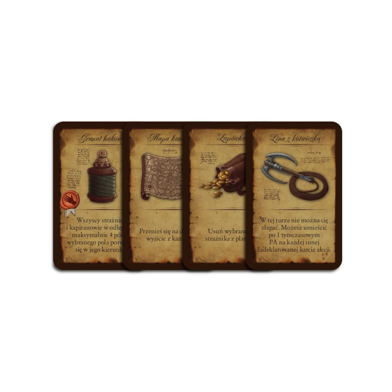 - 2 podstawowe, stałe karty akcji, dzięki którym zawsze będzie mógł się poruszyć lub dobrać nowe karty,