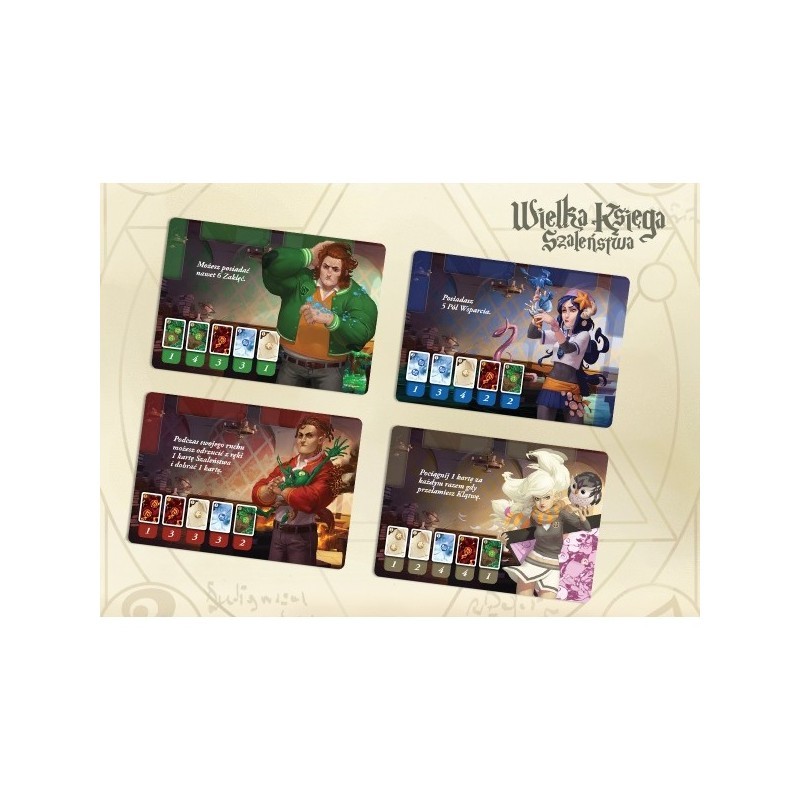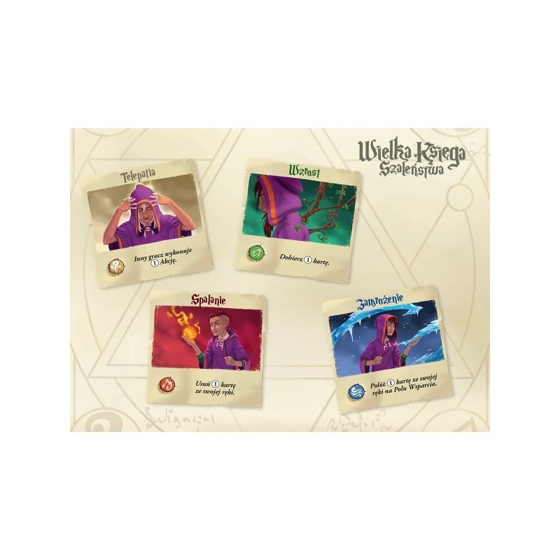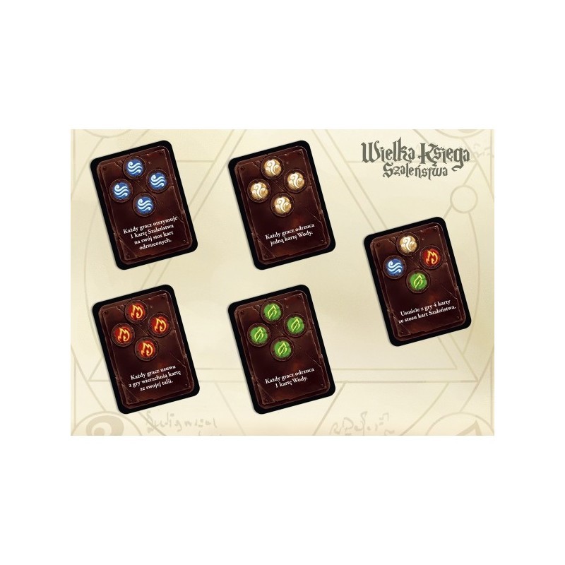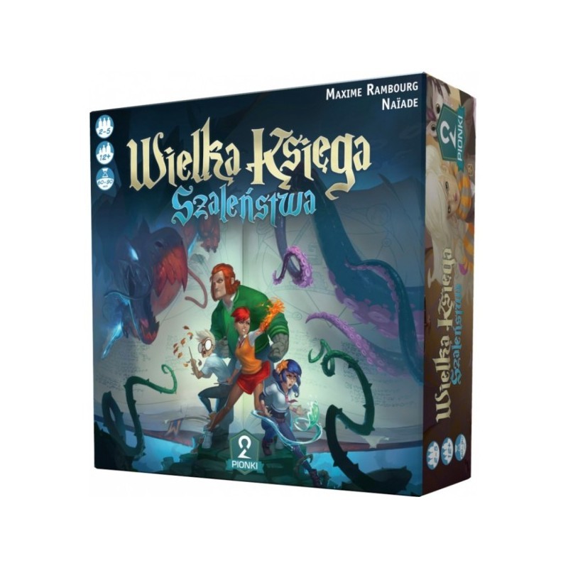 Wielka Księga Szaleństwa to gra kooperacyjna oparta o mechanizm budowania talii. To emocjonująca przygoda zarówno dla początkujących jak i bardziej zaawansowanych graczy. Podczas rozgrywki gracze wcielają się w uczniów czarodziejskiej szkoły magii, którzy otworzyli zakazaną księgę szaleństwa uwalniając magiczne stwory starające się ich opętać.