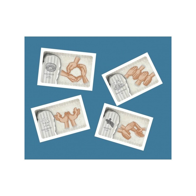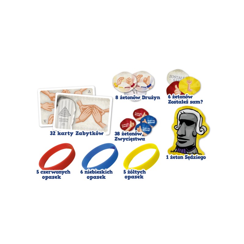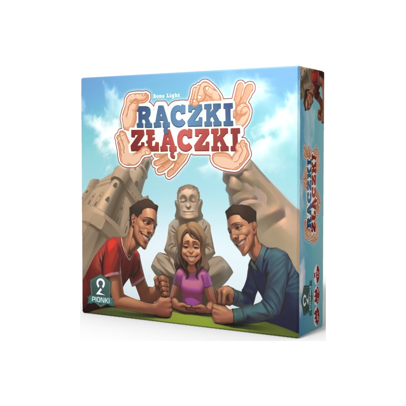 Rączki Złączki to gra imprezowa, w której przeplata się zręczność i kooperacja!Każdy z graczy zakłada kolorową opaskę na nadgarstek. Na sygnał sędziego, każdy z gracze zza pleców wyciąga rękę i formuje z innymi graczami, z tym samym kolorem opaski drużyny. W zależności od tego ilu graczy jest w danej drużynie, gracze muszą ułożyć słynna architektoniczną budowle wskazaną przez instrukcję na odpowiedniej karcie. Podczas gry będziemy tworzyć takie budowle jak Wielki Mur Chiński, Wiszące Ogrody Semiramidy czy słynne Piramidy. W pudełku znajdziemy również znane polskie obiekty takie jak, hala sportowa – Spodek, Smok Wawelski, Dąb Bartek i inne!Wszyscy gracze w najszybszej drużynie otrzymają punkty na rękę, której użyli do budowy obiektu.