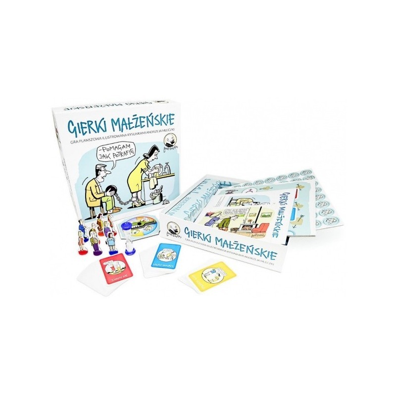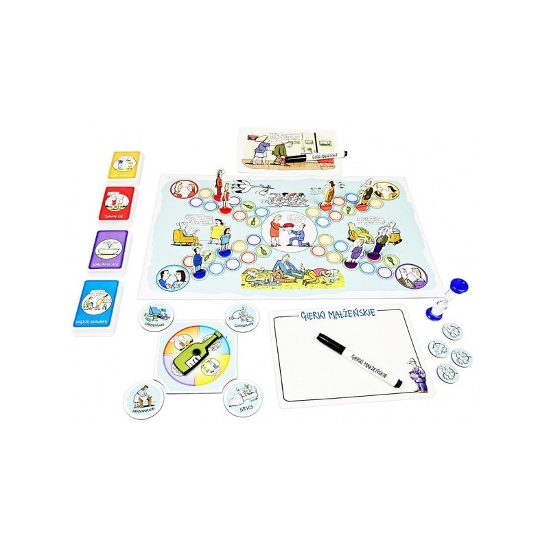 W Gierkach Małżeńskich będziecie przesuwać swoje pionki po planszy, wchodząc po kolei na pola z zadaniami losowanymi z czterech talii kart. Za rozwiązywanie zadań otrzymacie żetony kupidyna. Wygrywa para z największą pulą żetonów.