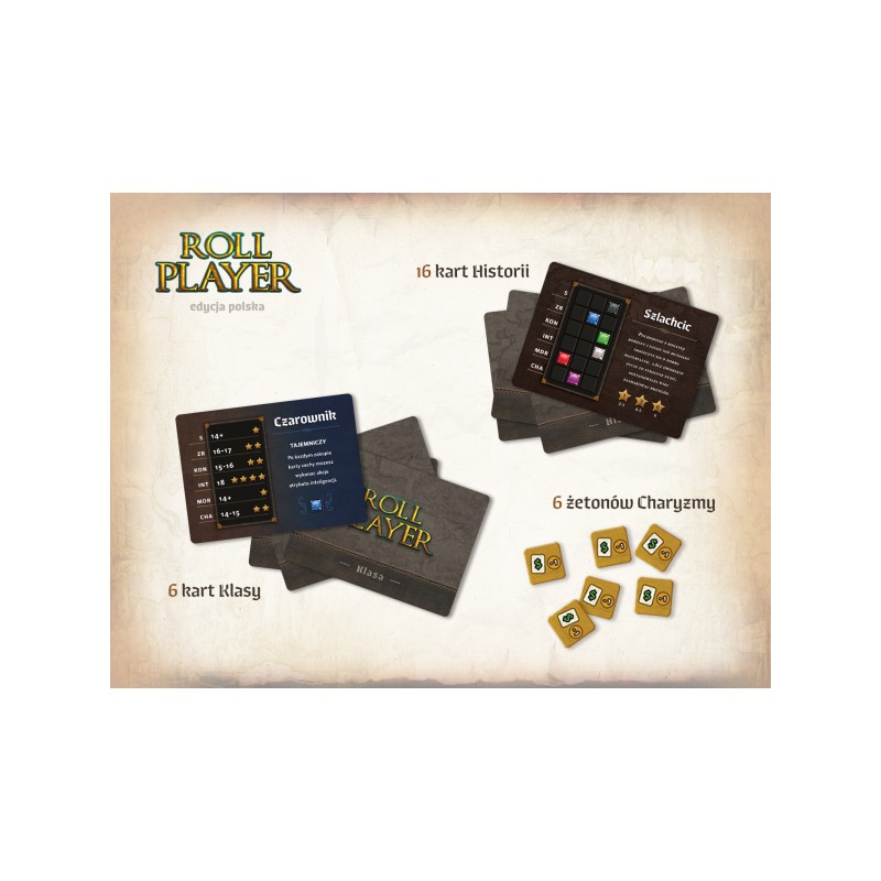 Wiemy już, że Roll Player to gra o tworzeniu postaci. Zabawę zaczniecie więc od wybrania jednej z klasycznych dla fantasy ras (Elf, Krasnolud, Niziołek i Człowiek). Następnie wylosujecie profesję Waszego bohatera (kartę Klasy), a także jej unikatową historię oraz charakter. Wszystkie te elementy będą miały znaczenie w dalszej rozgrywce, a liczba ich kombinacji wpływa wprost na wysoką regrywalność gry.