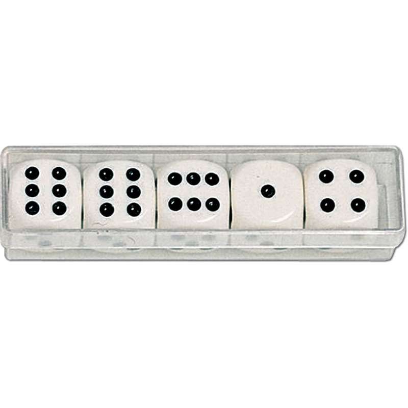 Zestaw 5 dużych kości (22 mm) w przezroczystym etui. Dołączona instrukcja do gry w kości oczkowe w języku polskim.