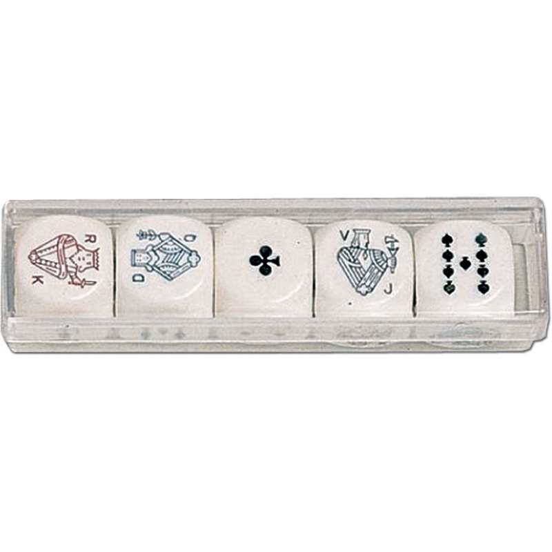 Zestaw 5 dużych kości (22 mm) w przezroczystym etui. Dołączona instrukcja do gry w kości pokerowe w języku polskim.