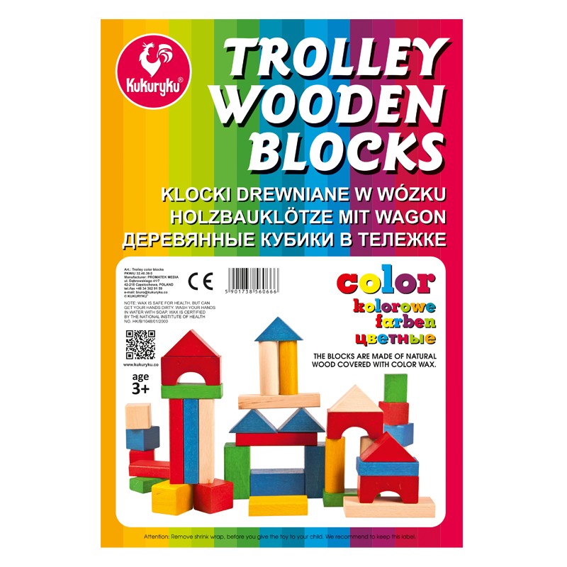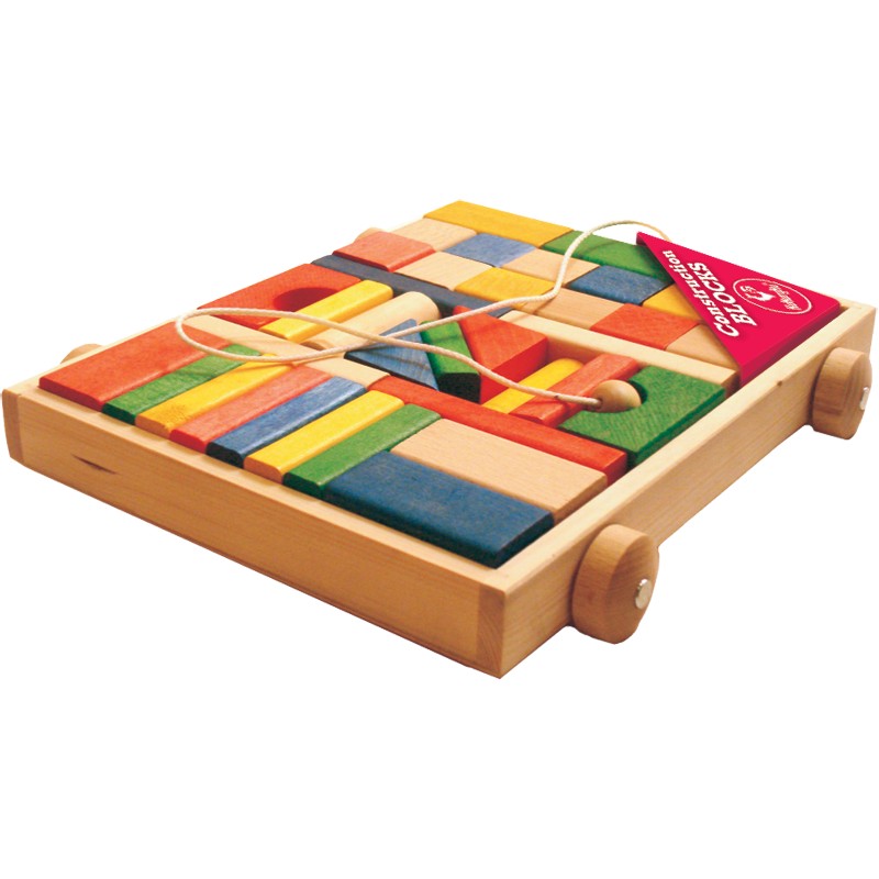 Zestaw 37 kolorowych klocków zapakowanych w wózeczku, który może pełni funkcje zabawki i pojemnika do przechowywania klocków.