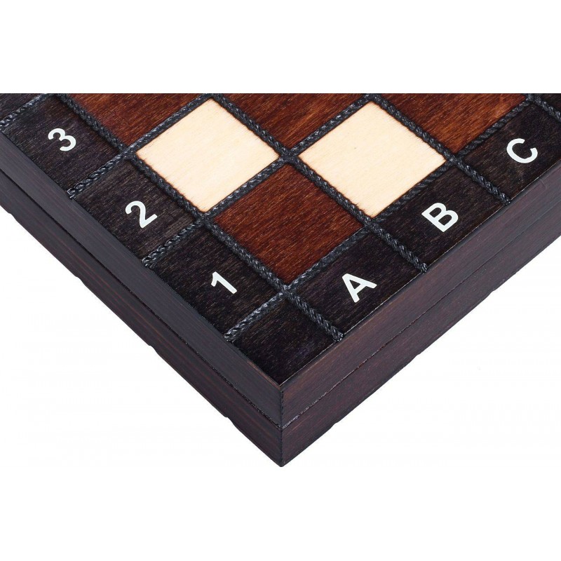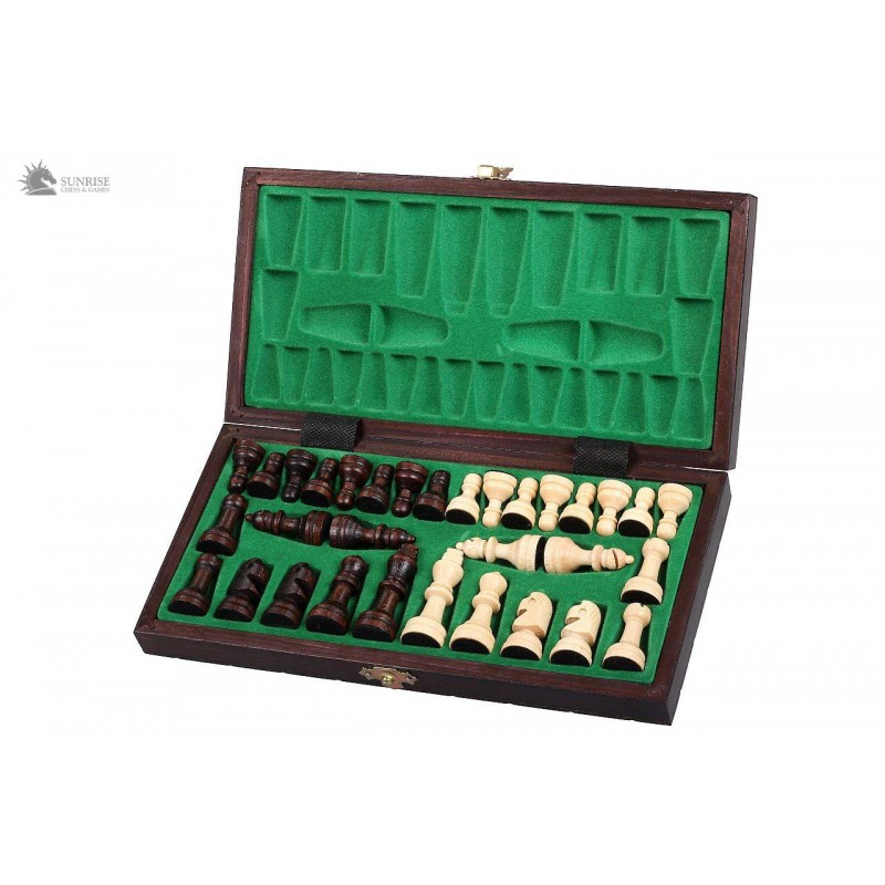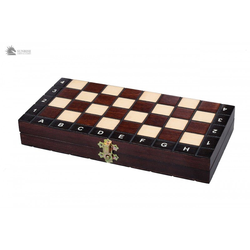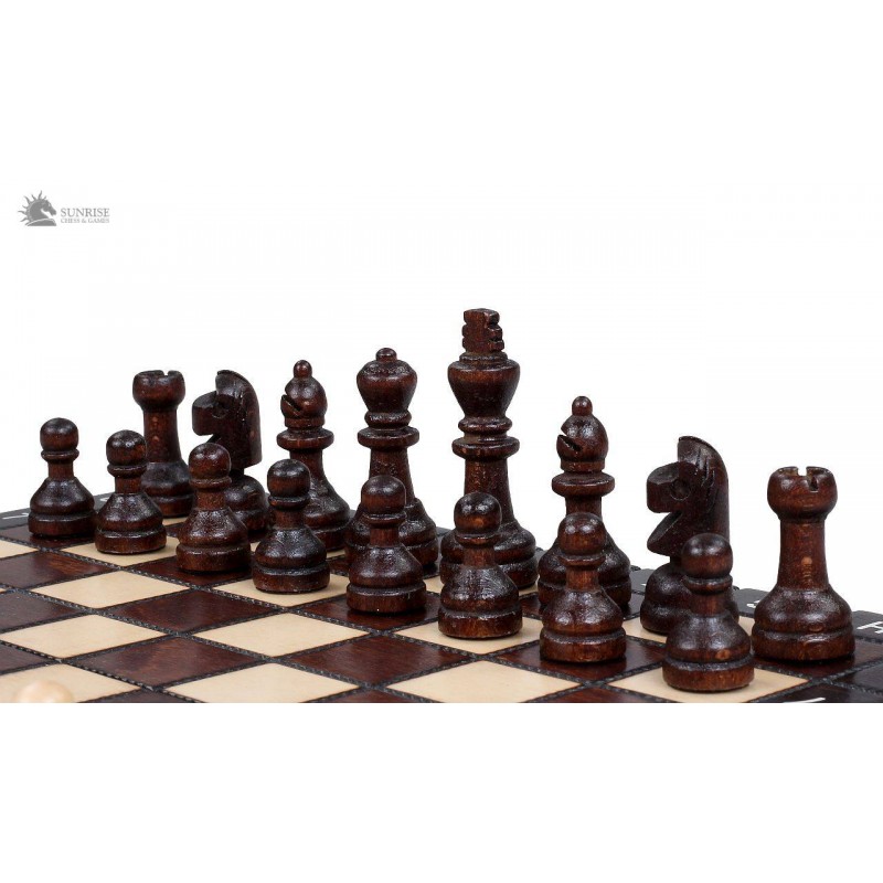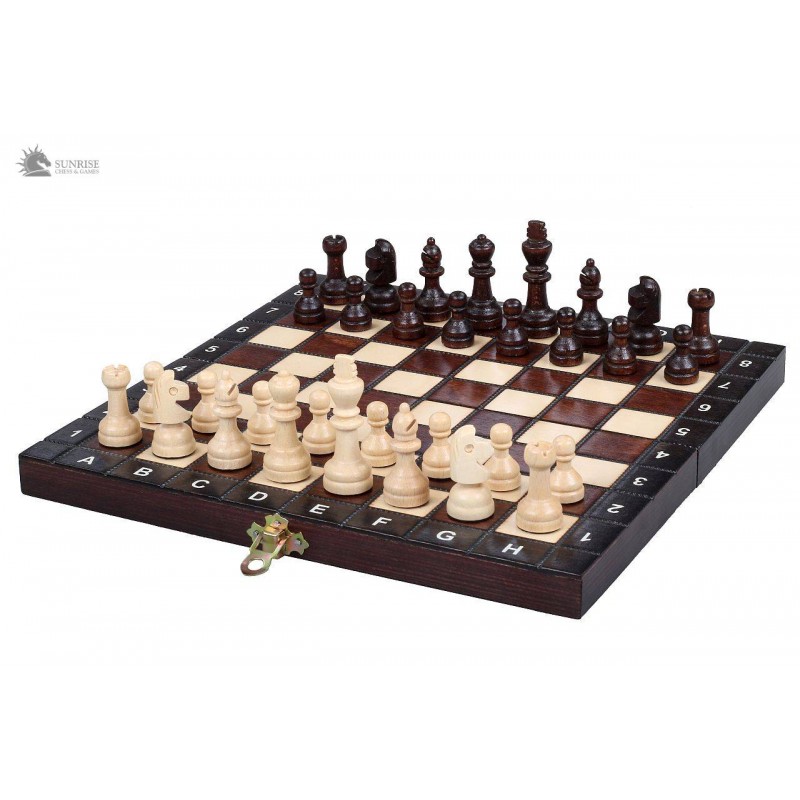 Szachy szkolne to jeden z najpopularniejszych kompaktowych zestawów szachowych. Figury szachowe w klasycznym stylu, wykonano z grabu. Wysokość króla wynosi 6 cm. Tradycyjna drewniana szachownica została wyposażona w dopasowaną wkładkę do przechowywania figur.