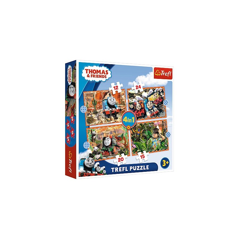 Puzzle 4w1 wysokiej jakości, cenionej marki Trefl z czteroma obrazkami z bohaterami bajki Tomek i przyjaciele.