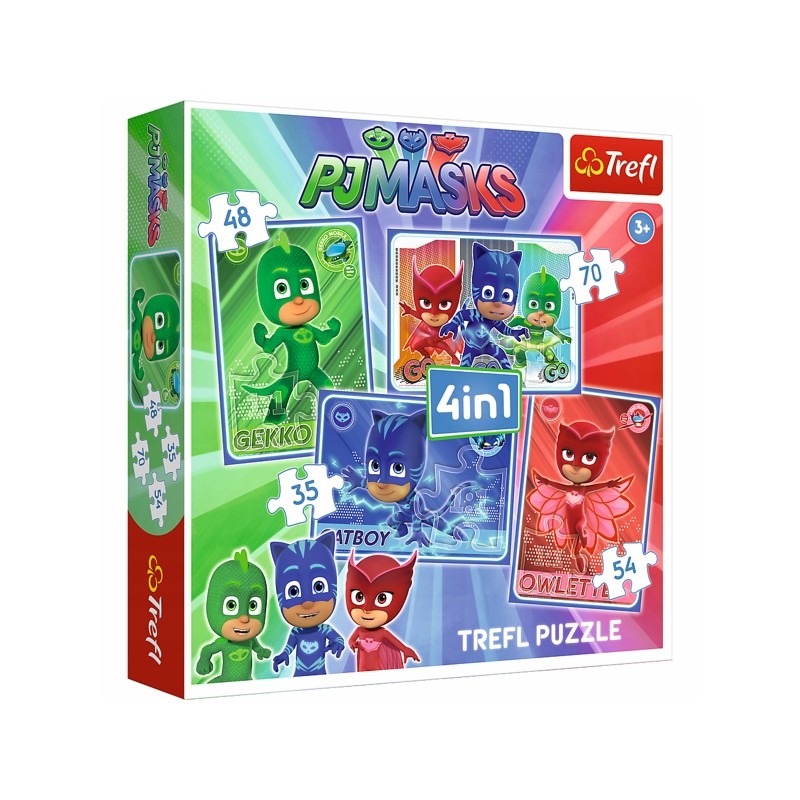 Puzzle 4w1 wysokiej jakości, cenionej marki Trefl z czteroma obrazkami z bohaterami bajk Pidżamersi.