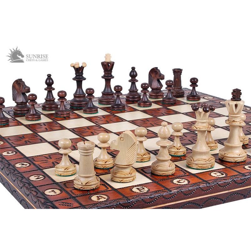 Szachy Junior są mniejszą wersją kompletu Royal - rozmiar składanej kasety wynosi 42x21cm, w odróżnieniu od rozmiaru kasety zestawu Royal wynoszącego 54x27cm. Figury szachowe z wypalanymi zdobieniami wykonane są z drewna grabowego oraz jaworowego i są obciążone. Na ciemnych polach deski zostały wypalone unikatowe zdobienia. Wypalana składana deska szachowa ma wewnątrz wkładkę na figury.