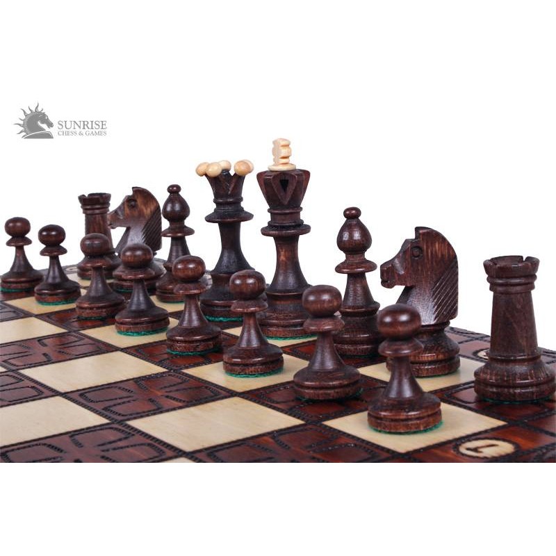 Szachy Junior są mniejszą wersją kompletu Royal - rozmiar składanej kasety wynosi 42x21cm, w odróżnieniu od rozmiaru kasety zestawu Royal wynoszącego 54x27cm. Figury szachowe z wypalanymi zdobieniami wykonane są z drewna grabowego oraz jaworowego i są obciążone.