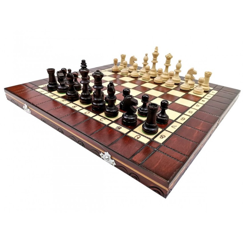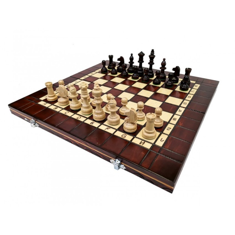 Szachownica turniejowa nr 4 składana na dwa została wyprodukowana przy użyciu metody wypalania, dzięki czemu zyskała efektowny i oryginalny wygląd. Jest to wyjątkowa, a przy tym klasyczna szachownica w kolorze mahoniu. Wewnątrz kasetki znajdziemy plastikową wkładkę na figury.