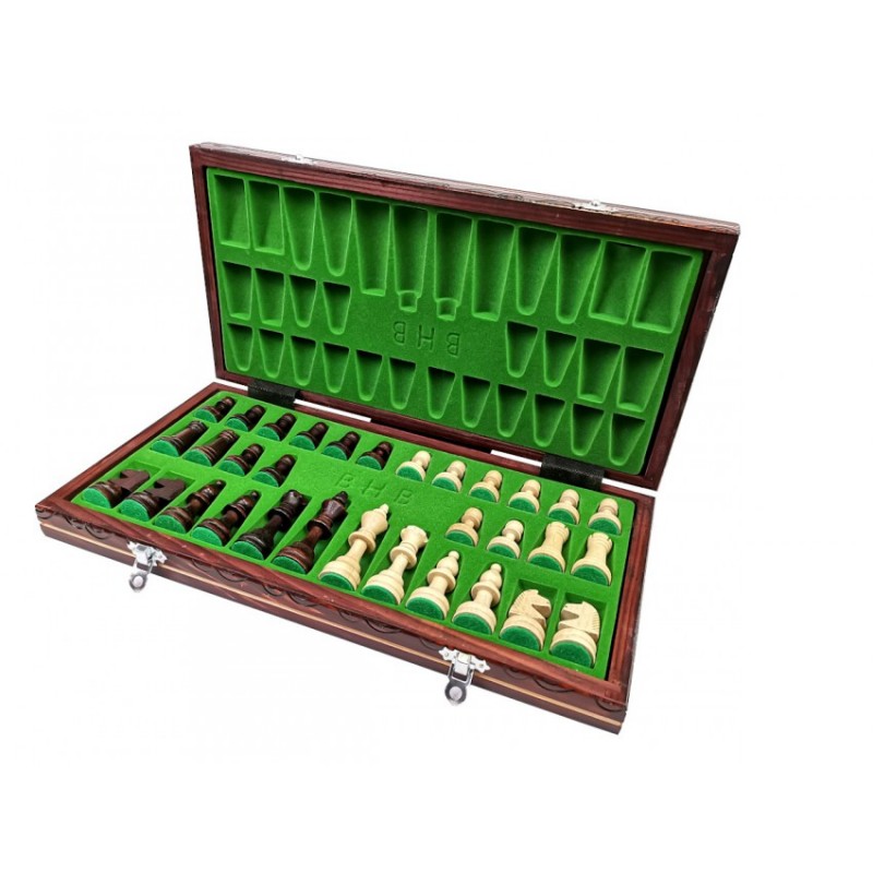 Figury szachowe są wykonane z drewna grabowego i jaworowego w stylu królewskim. Składana deska szachowa posiada dwie wykończone wewnątrz filcem komory na figury.