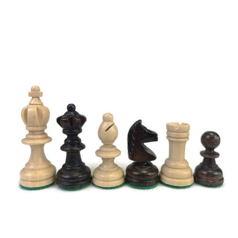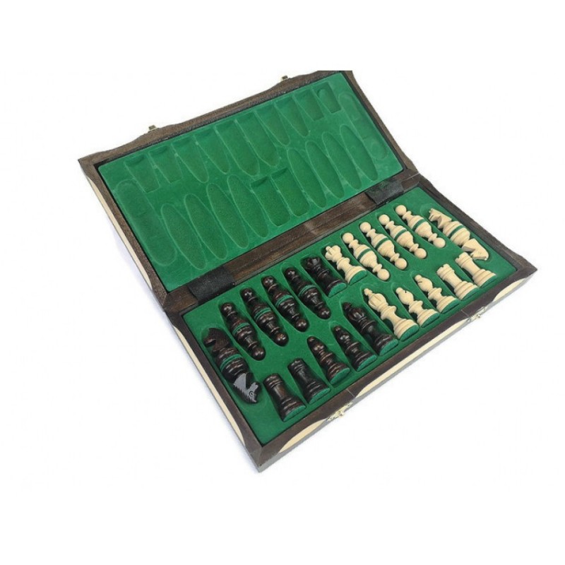 FIGURY drewniane, obciążone, wkładane do specjalnej kasetki wewnątrz szachownicy.