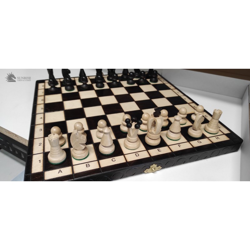 Jest to średni komplet szachów królewskich i jeden z najbardziej popularnych kompletów amatorskich. Wyposażono go we wkładkę na figury szachowe. Figury wykonane są z drewna jaworowego.