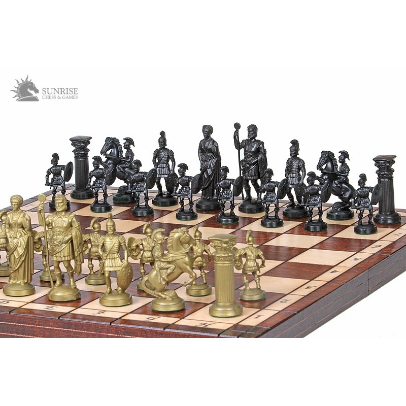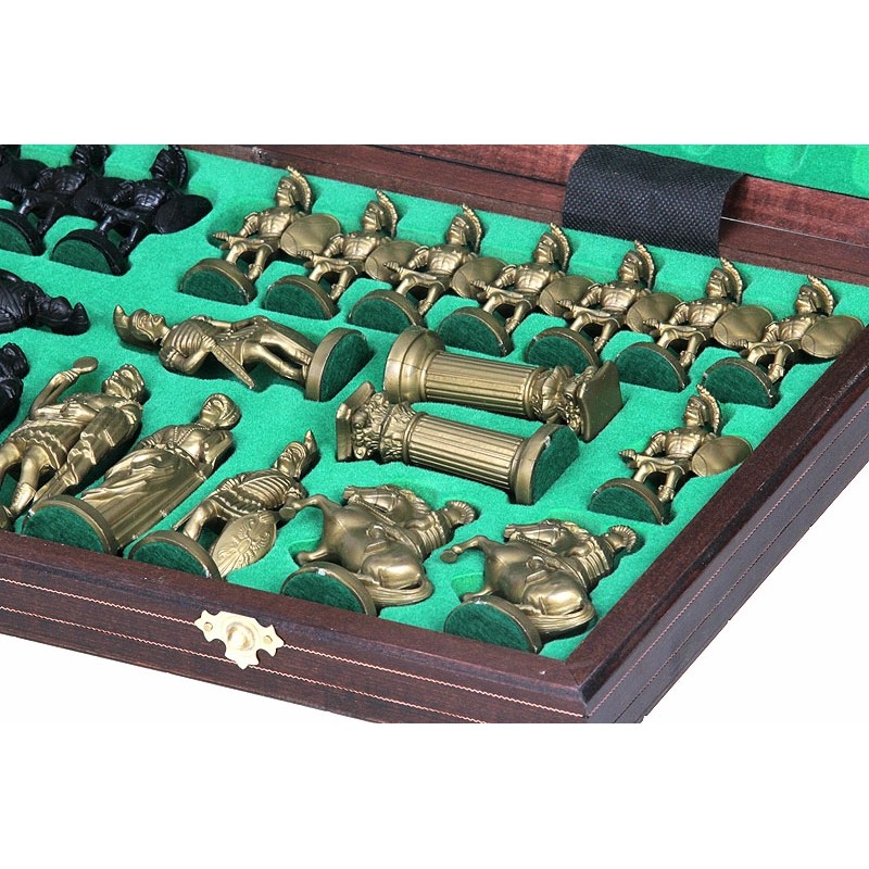 Styl szachów Spartan jest taki sam jak jednych z naszych starszych kompletów - Metal. Jednakże komplet zawiera figury wykonane z obciążanego plastiku. Przepiękna wypalana, składana deska szachowa posiada wewnątrz wkładkę filcową idealnie pasującą do figur. Figury w tym komplecie są złote i czarne, deska zaś jest brązowa.