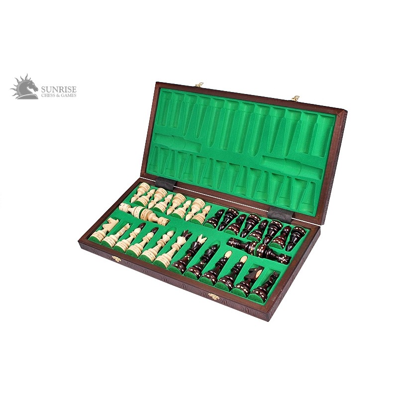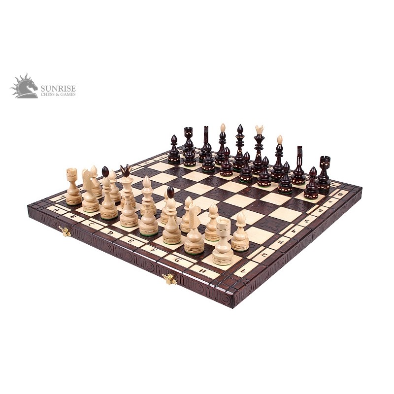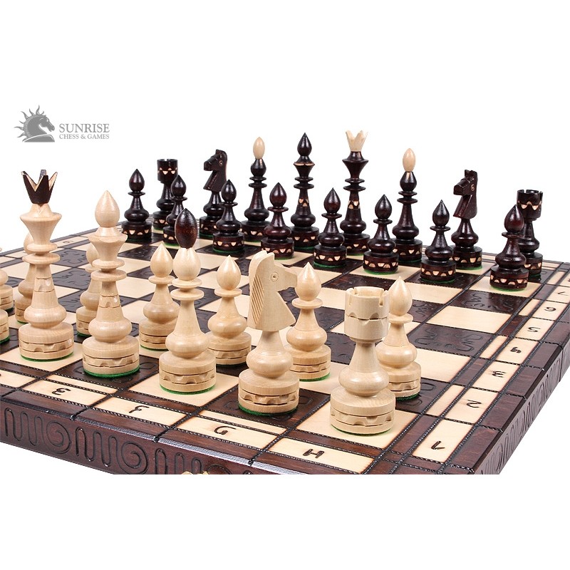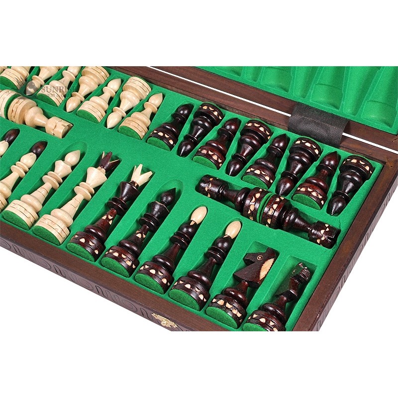 Tradycyjne szachy drewniane w stylu indyjskim przykuwają oko dzięki wspaniale rzeźbionym figurom. Do ich wykonania użyto wysokiej jakości drewna grabowego. Król w tym zestawie ma wysokość 12 cm. Tradycyjna drewniana szachownica ręcznie wypalana i malowana pozwala na wygodną, długą grę.