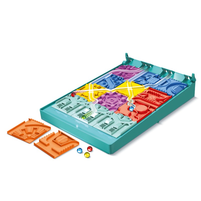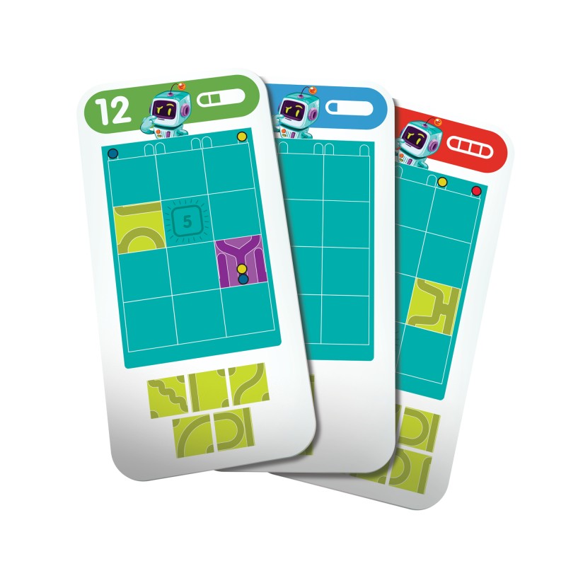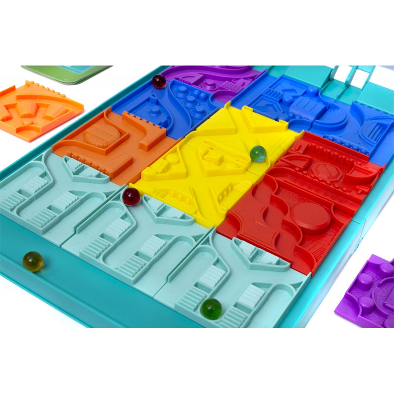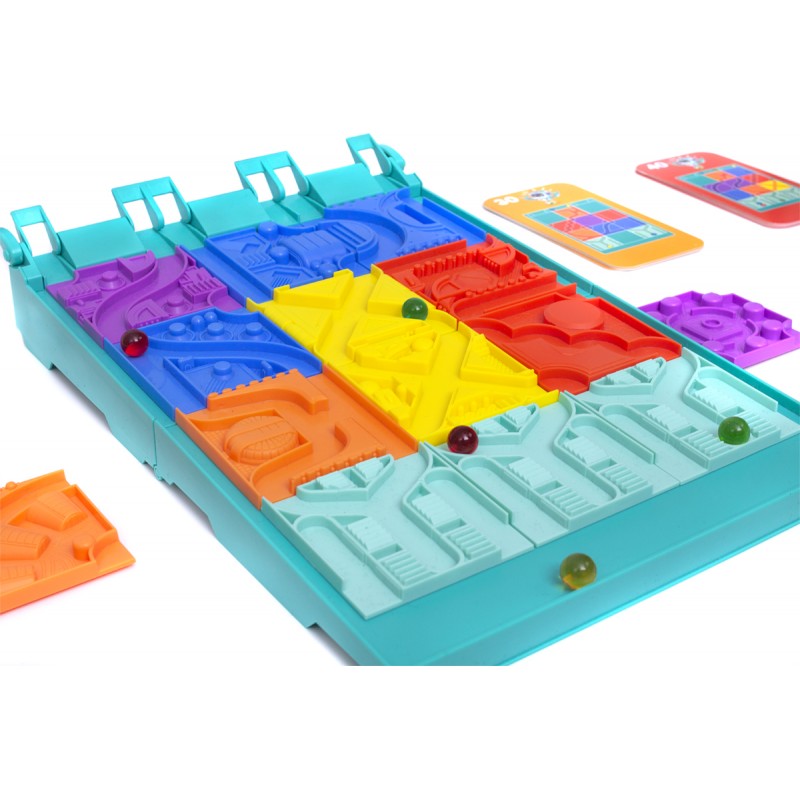 Każda z kart określa, jakich kafelków torów możemy użyć. Twoim zdaniem jest rozmieszczenie ich w taki sposób, by po zwolnieniu blokady kulki dotarły do miejsca przeznaczenia.