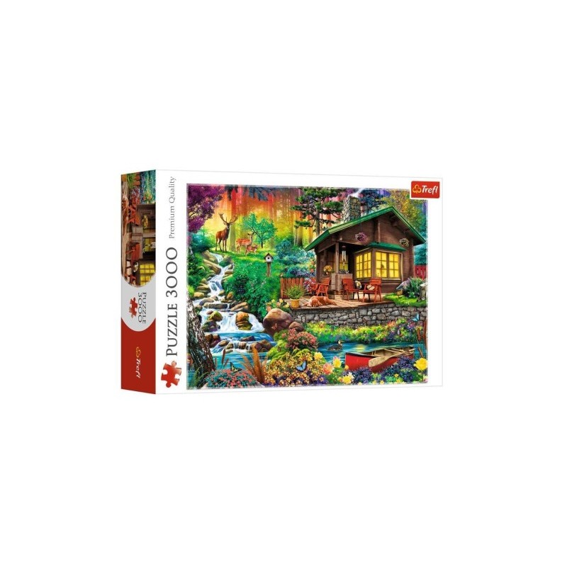 Puzzle 3000 elementów przedstawiające chatkę w lesie.
