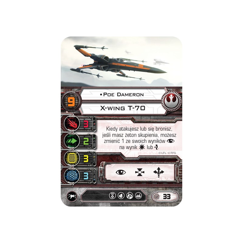 Przez wiele pokoleń frachtowce YT-1300 stanowiły ulubione statki zarówno przemytników, jak i uczciwych kupców. Spersonalizowany X-wing T-70 Poego Damerona wyróżnia się wykonanym na specjalne zamówienie najlepszego pilota Ruchu Oporu ferrosferowym malowaniem, rozpraszającym odczyty czujników. Obydwa statki odegrały kluczową rolę w ataku na Bazę Starkiller. Niniejszy zestaw zawiera wszystkie elementy niezbędne, aby dodać do gry 1 Sokoła Millenium (YT-1300) oraz 1 Czarnego (X-winga T-70).